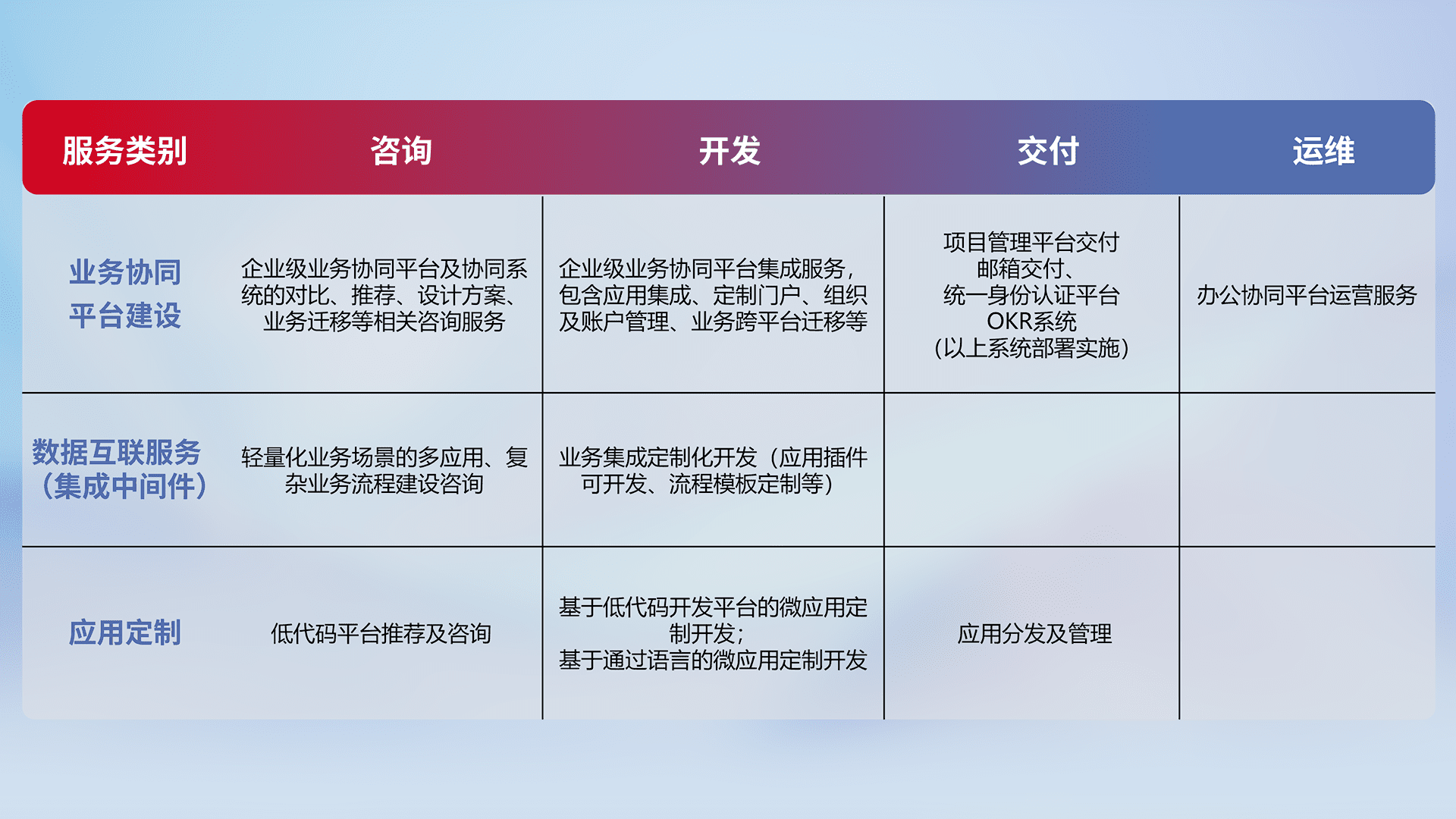 针对钉钉、、企微、、、IDaas等平台级产品提供产品的规划、、方案、、、、交付、、、、定制化开发等服务,,,,实现如统一协同办公、、、、智能客户服务、、混合会议管理、、智能数据查询、、等业务场景,,,实现数字化转型。。