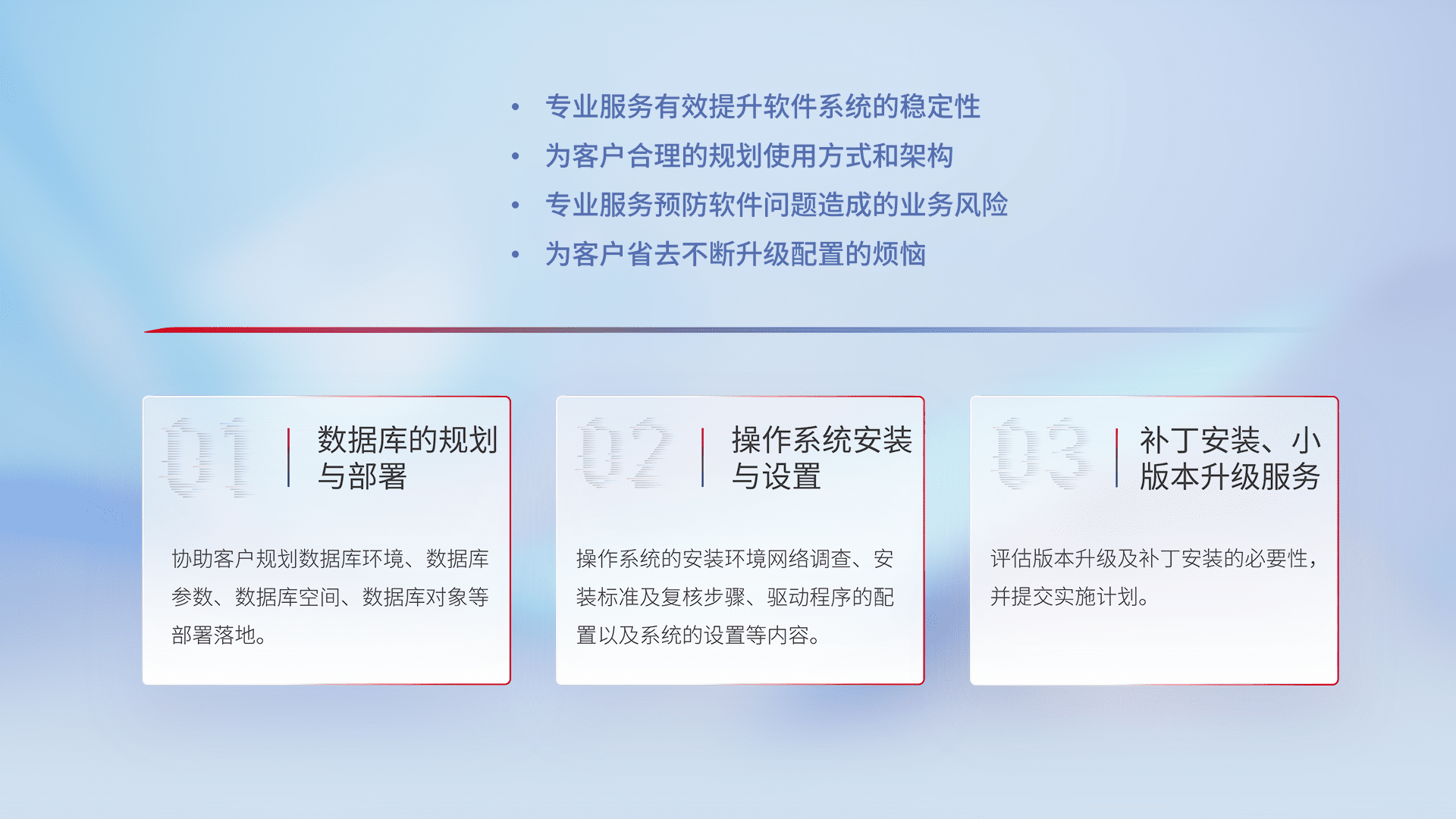 为客户提供软件规模升级、、、、快速部署、、、、按需配置的专业服务,,,,从数据库的规划与部署到操作系统的安装与设置,,再到补丁安装和小版本升级提供支持。。。